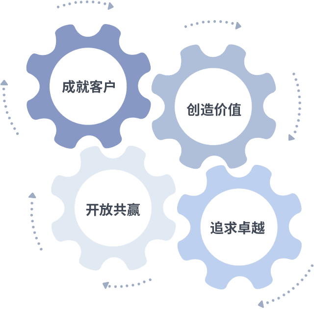 成就客户是一切决策的出发点,,,,创造价值是衡量所有工作的标准,,,,追求卓越是我们做事做人的态度,,开放共赢是我们的格局也是最终的结果。。价值观的齿轮环环相扣,,推动着组织里的每个人不断向前。。。。