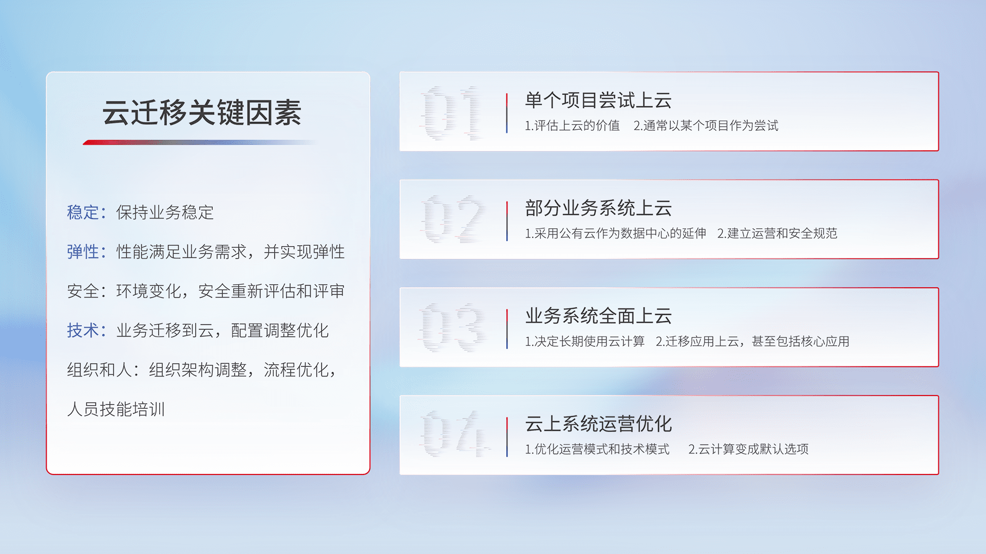 结合实际业务,,,,从规划设计、、、、云平台选型、、、云原生改造、、、数据迁移、、、集成交付,,迁移全过程为客户识别最佳上云路径,,,,做好风险识别管理,,设计网络架构、、、、身份权限、、安全审计合规、、、、操作审计、、日志审计、、、监控告警策略、、多站点容灾设计等,,,对云上基础设施进行整体规划,,提升IT治理水平,,,以满足弹性、、、高可用、、、、高性能的需求。。